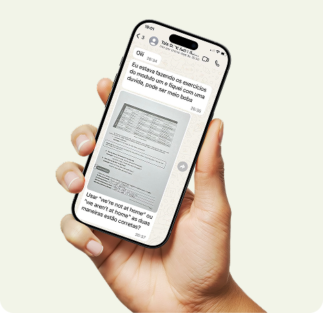 Temos um número de whats só para alunos, e os professores enviam áudios para praticar oralidade. O aluno responde em áudio e recebe correção. Pode também tirar as dúvidas com nossa equipe de profes! Esse recurso está liberado a todos os estudantes do curso, de todos os 5 níveis. Cada pessoa recebe conteúdos conforme o nível que está estudando no momento.